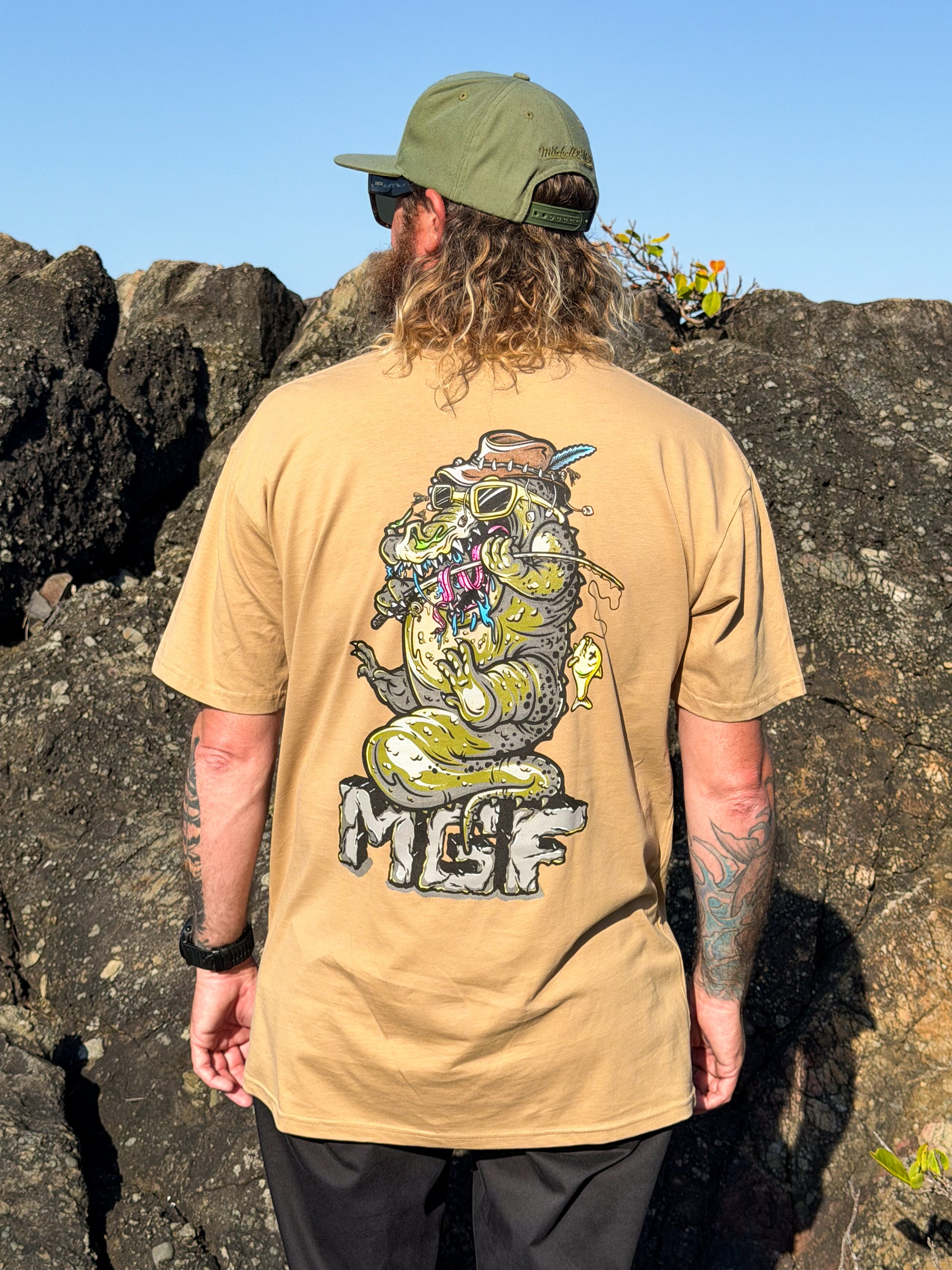 Cruising down the beach in this legendary tee that will be the epitome of your wardrobe stables. Featuring our large MGF Crocbait logo on the back and a snot green MGF pocket logo on the front. This is the coolest tee we've done and absolutely my favourite!